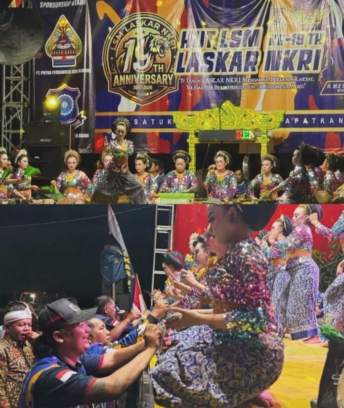 KARAWANG – Hiburan rakyat Jaipongan dalam rangkaian kemeriahan HUT ke-19 Tahun LSM Laskar NKRI di Lapangan Situ Cipule, Desa Mulyasari, Kecamatan Ciampel, Kabupaten Karawang, pada Jumat (10/4/2026) malam, berlangsung meriah.