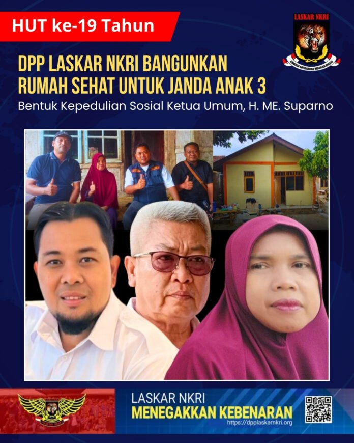 KARAWANG – Dalam rangka menyambut milangkala atau hari ulang ulang (HUT) ke-19 tahun yang tepatnya jatuh pada 26 Maret 2026 mendatang, DPP LSM Laskar NKRI membangunkan rumah layak huni bagi Ibu Siti Khodijah, janda anak 3 yang merupakan warga Desa Sumurkondang, Kecamatan Klari Kabupaten Karawang – Jawa Barat.